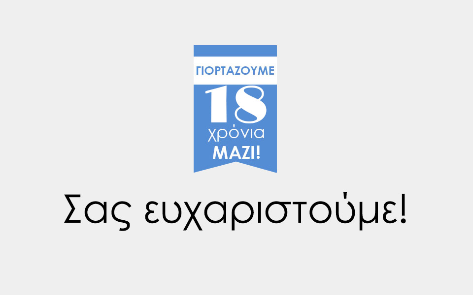 Γιορτάζουμε τα 18 χρόνια λειτουργίας της επιχείρησής μας και γι’ αυτό θα θέλαμε να ευχαριστήσουμε θερμά όλους εσάς, που όλο αυτό το διάστημα συνεχίζετε να μας στηρίζετε με την εμπιστοσύνη και προτίμησή σας.